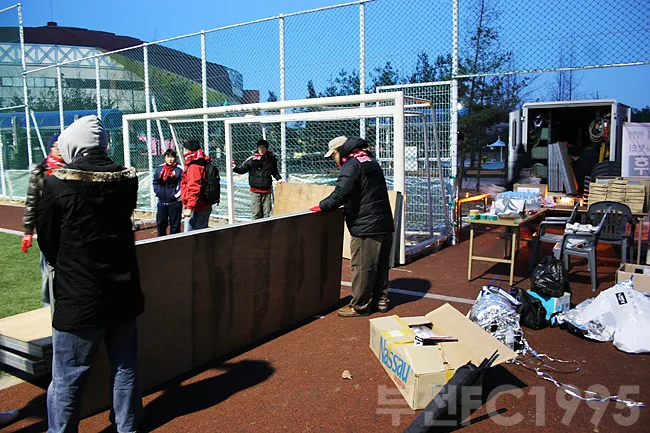 – 벤치, 코너 플랙, 골대 그물, A보드 등 경기 전반에 필요한 모든 시설은 경기 지원팀을 중심으로 팬들이 경기 당일 일찍와서 설치하였고, 경기 중에는 응원을 하였다. 경기가 끝나면 모두 다 경기장으로 내려와 철수하는 작업을 하였다. 경기를 볼 수 없는 티켓 판매 업무는 아르바이트를 고용하여 해결했다. 하지만 아르바이트가 없을 때는 일부 팬들이 경기 관전을 포기하고 티켓을 팔았다.